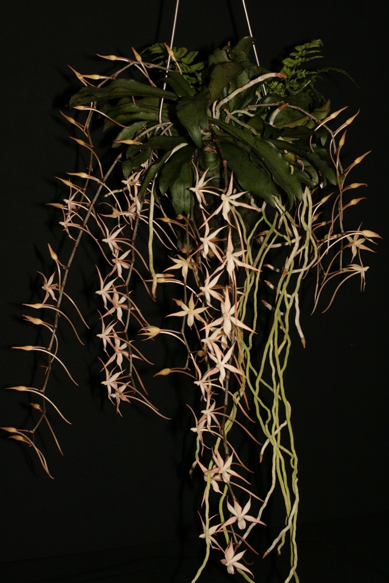 Aerangis distincta usually grows better and look better when mounted on uneven bark washers and they may require watering several times a day in hot and dry weather. They can be grown in small, 8-13 cm hanging pots or baskets, filled with a very thick, loose, well-permeable substrate that keeps the plant, but it allows the roots to grow out of the container.